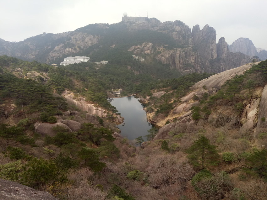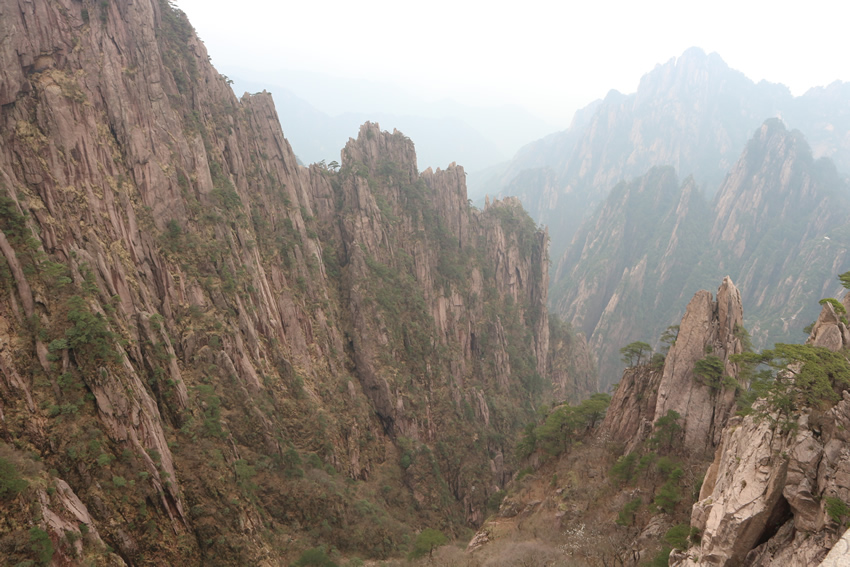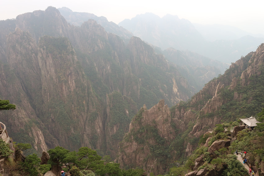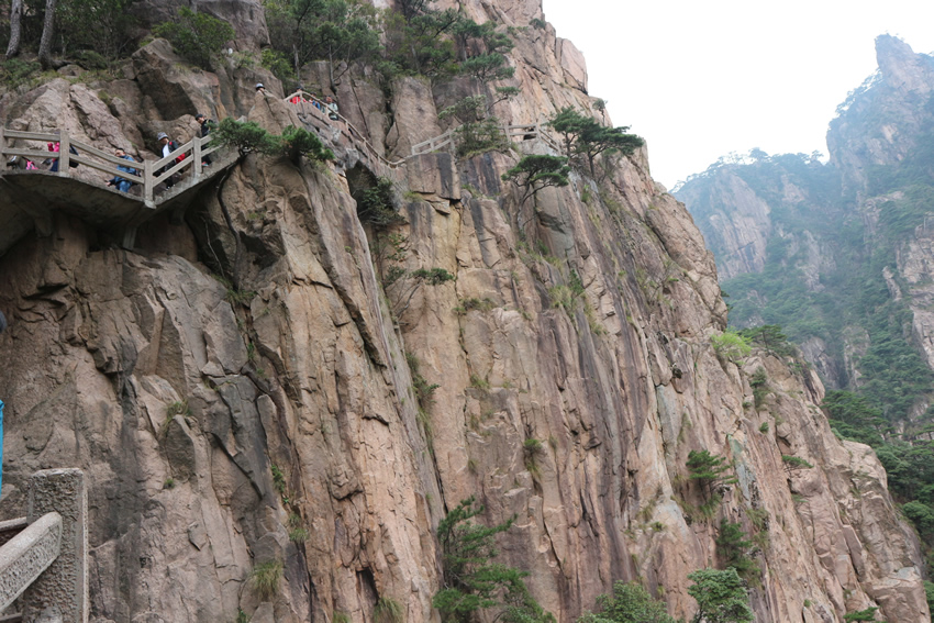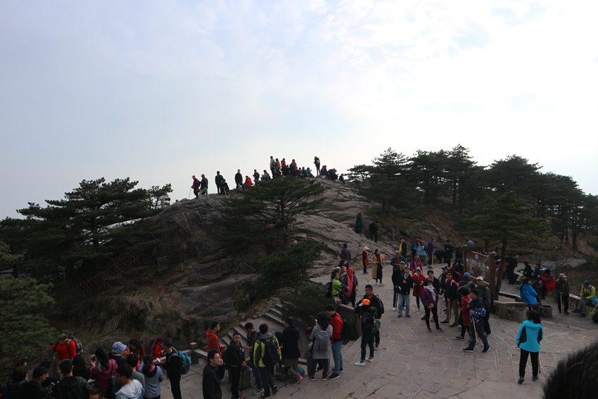 接著,我們來到了天下第一奇山——黃山。黃山原名黟山,因峰巖青黑,遙望蒼黛而得名。后因傳說軒轅黃帝曾在此煉丹,故改名為“黃山”,一直沿用至今,發展成如今中國最著名的旅游景區之一,素有“五岳歸來不看山,黃山歸來不看岳”的美名。我們在黃山風景區換乘中心坐環保車至慈光閣,25分鐘的車程卻經歷了好多個和武當山一樣的180度的大轉彎,身子隨著車來回晃蕩,緊張又刺激。車上有幾位游客搞怪似的唱起了《山路十八彎》,十分應景,大家啼笑皆非,卻也輕松了許多。接著我們坐纜車到達玉屏樓景區,此時已是人山人海,好不熱鬧。導游帶領大家觀賞了迎客松、送客松、陪客松、文殊臺、玉屏臥佛等景點,眺望天都峰。黃山風景區面積160.6平方千米,東起黃獅,西至小嶺腳,北始二龍橋,南達湯口鎮,分為溫泉、云谷、玉屏、北海、松谷、釣橋、浮溪、洋湖、福固九個管理區,爬山路線很多,前山上后山下,或后山上前山下,所以上山時還有很多游客在同一條路下山。山路比較窄,人擠人,一開始并不太好走。到了蓮花新道,不再那么擁擠,一路上途觀到黃山最高峰--蓮花峰,經過又陡又窄的一線天來到了鰲魚洞,觀賞鰲魚峰、鰲魚馱金龜。在天海區白云賓館旁稍作歇息后,馬不停蹄爬上第二個高峰--光明頂:飛來石、東海、南海、西海、北海和天海,五海煙云及怪石盡收眼底。