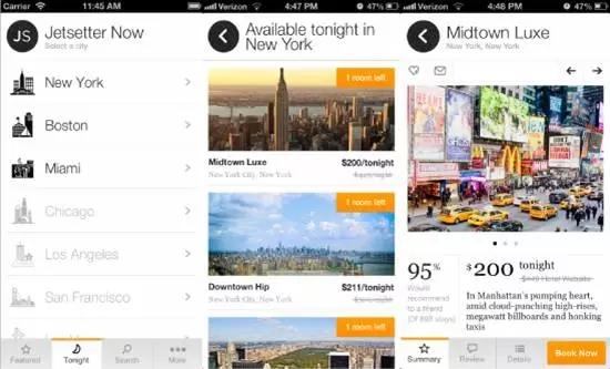值得一提的是, Jetsetter APP的預訂流程相當流暢,從選擇到預訂只需3個步驟。精巧的圖像捕捉功能已迅速成為了標配,它極大地簡化了輸入支付信息的繁瑣流程。同時Jetsetter的APP界面精美簡約、優雅不凡,可以說達到了藝術品的水平,只需一眼,就讓你難以舍棄。